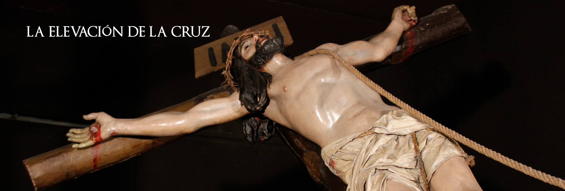 El grupo de La Elevación de la Cruz representa el momento en el que Jesús ya clavado en la cruz es izado. Está compuesto por ocho imágenes talladas en pino, simulando los ropajes telas encoladas: la figura de Cristo lleva corona de espinas postiza y largo paño de pureza. La cruz sobre la que va clavada dispone de una bisagra que permitía abatirla mediante una larga horquilla utilizada antaño para poder meter el paso en la panera; tres sayones, uno de ellos agachado, sujetan y encajan la cruz en el hoyo del calvario, otro en un extremo tira de la cuerda. A uno de los sayones le falta un ojo, y no es que el autor lo concibiese tuerto, sino que se le partió antes de ponerlo. Contemplan la escena María la madre de Jesús, María Magdalena y arrodillado Juan, el discípulo amado. Esparcidas por el suelo rocoso hay varias herramientas y útiles: un cesto que contiene un martillo, tenazas, clavos, un mazo, pico y una pata de cabra. Desde su estreno dispuso también de la típica mesa con respiraderos de ojo de buey, hasta que en 1956 se cambió por la actual tallada por Alfonso Pastor Cadierno, y posteriormente reformada en 1973.