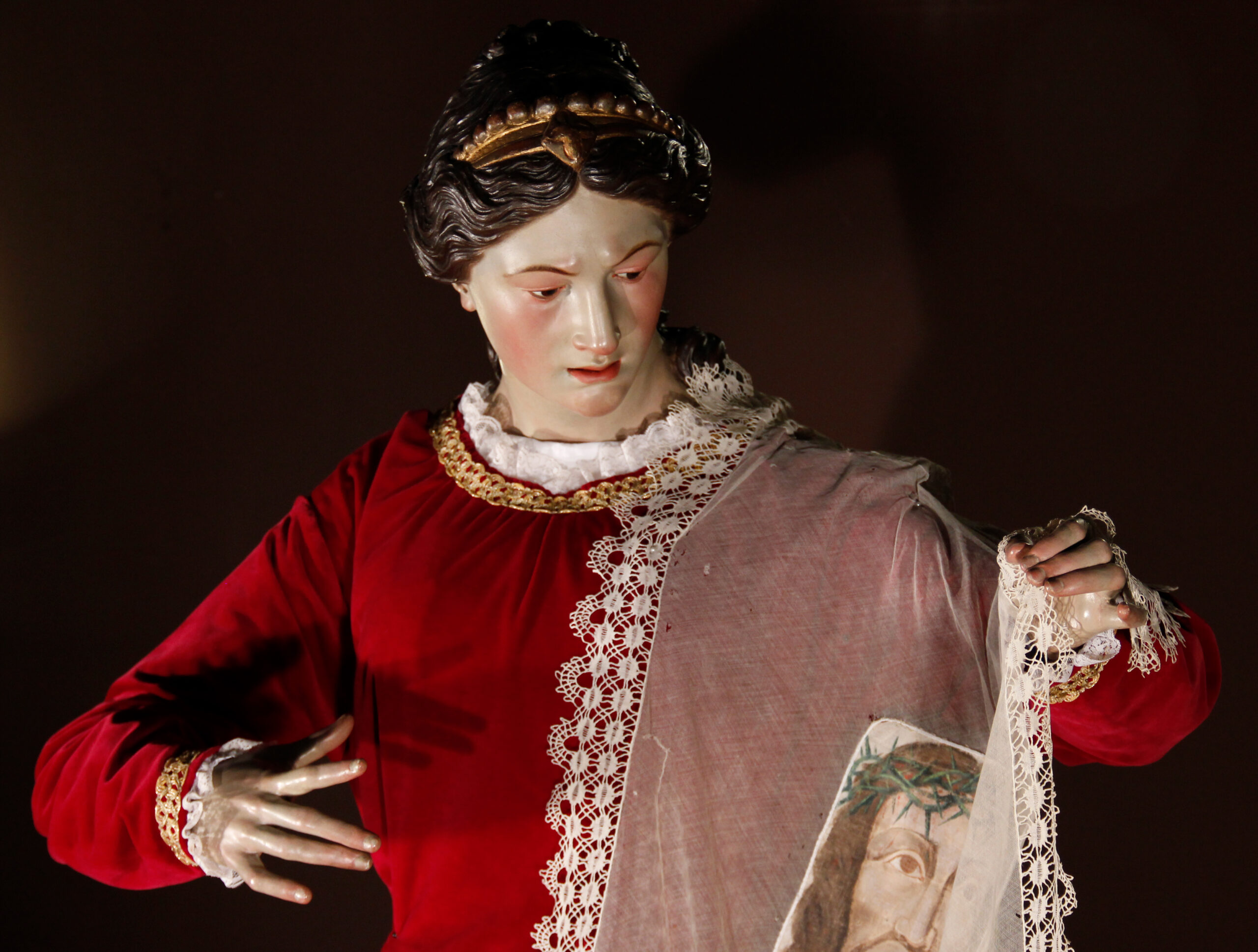 La Verónica es también imagen vestidera, tallada asimismo en pino. Mide 1,75 metros. A diario se viste con larga túnica de terciopelo carmesí, rematada con galón sencillo de oro. Lleva en sus manos un lienzo de encaje con la santa faz pintada. Para la procesión viste túnica del mismo color bordada en oro en 1966 por las religiosas del Convento de Santa Marina. Como acertadamente apuntó Jesús Hernández Pascual lo más destacado de su hechura, la cabeza, es una interpretación religiosa de la famosa Venus de Milo.